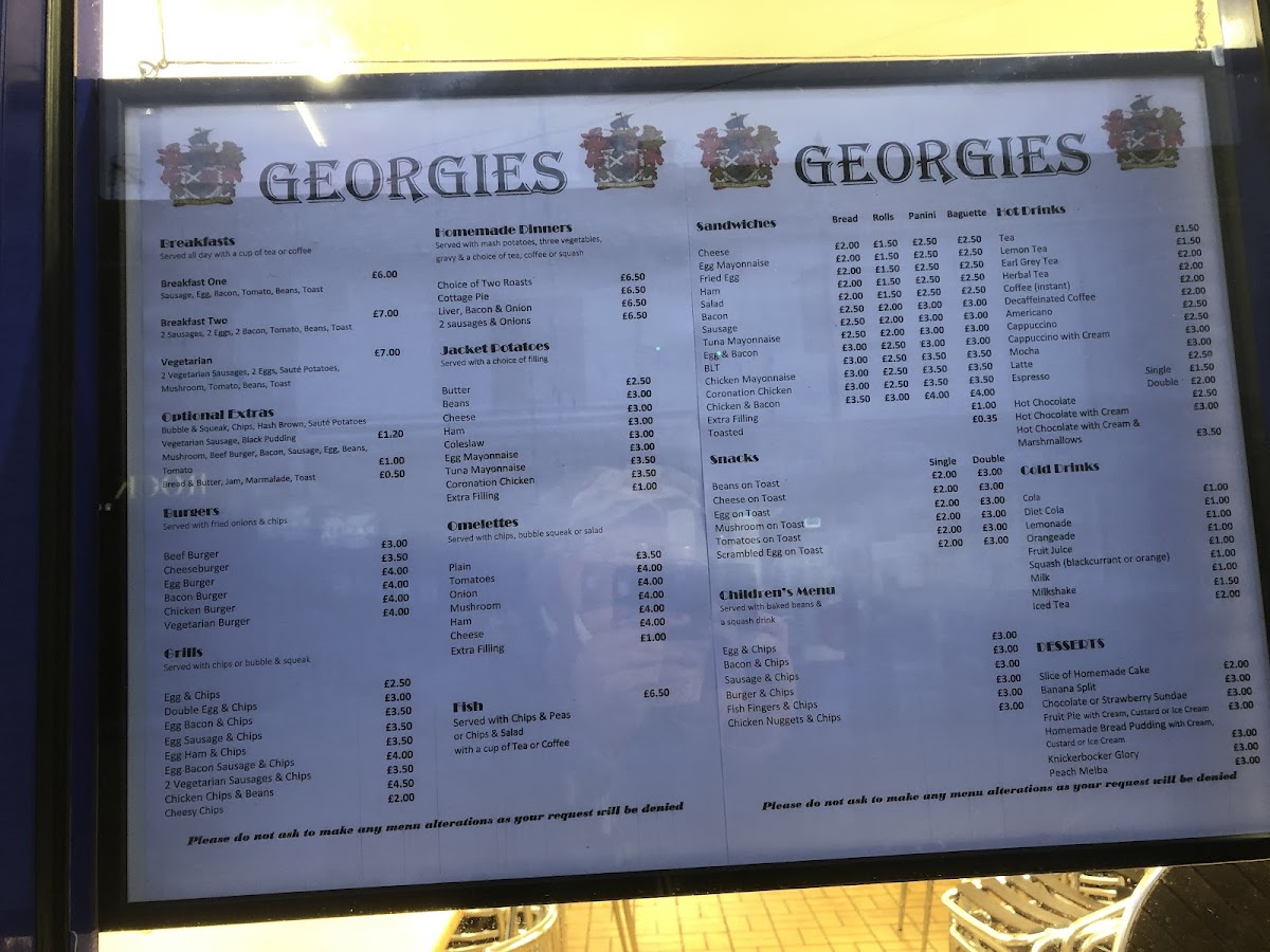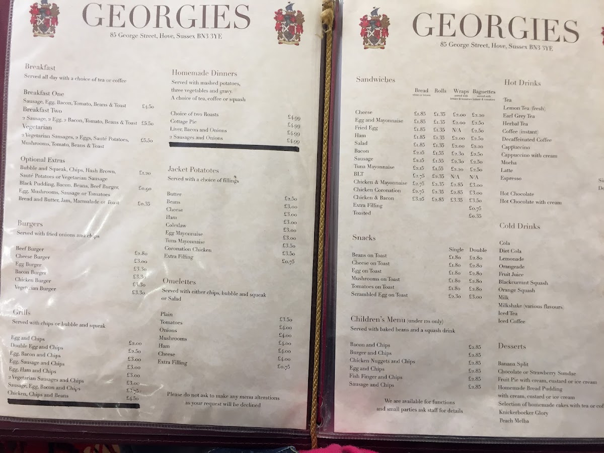The menu at Georgies offers a range of traditional British cafe and breakfast items suitable for morning and daytime meals. It includes categories such as burgers, grills, and jacket potatoes, providing options for quick, casual dining.