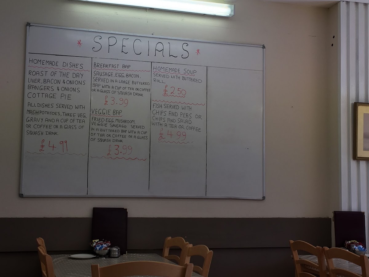 The menu also highlights traditional English dishes such as the English Breakfast and Sunday Roasts, with a specific mention of a Roast of the Day chicken option. These offerings are appropriate for breakfast, brunch, or light lunch occasions. Orders are typically suited for quick service in a casual setting.